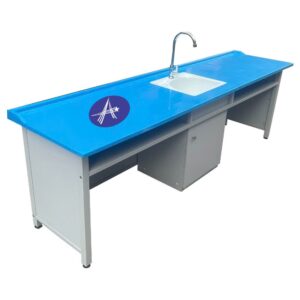 Đặc trưng của bàn hóa học là mặt bàn chống ăn mòn và tích hợp vòi nước cùng bồn rửa. Thiết kế này giúp hạn chế rủi ro khi tiếp xúc hóa chất. Đây là yếu tố bắt buộc để bảo đảm an toàn trong các tiết học thí nghiệm.